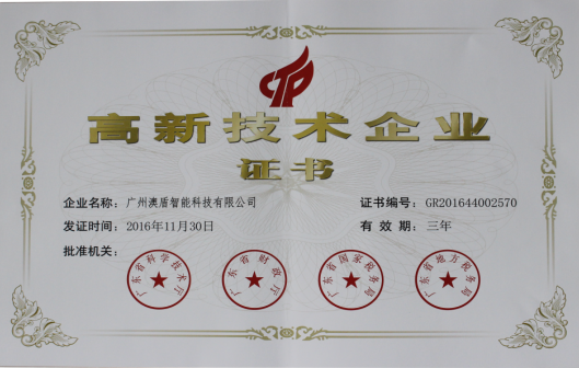 如今廣州澳盾已順利通過高新技術(shù)企業(yè)審核,并于近日收到由廣東省科學(xué)技術(shù)廳、廣東省財(cái)政廳、廣東省國家稅務(wù)局及廣東省地方稅務(wù)局聯(lián)合頒發(fā)的“高新技術(shù)企業(yè)”認(rèn)定牌匾及榮譽(yù)證書。